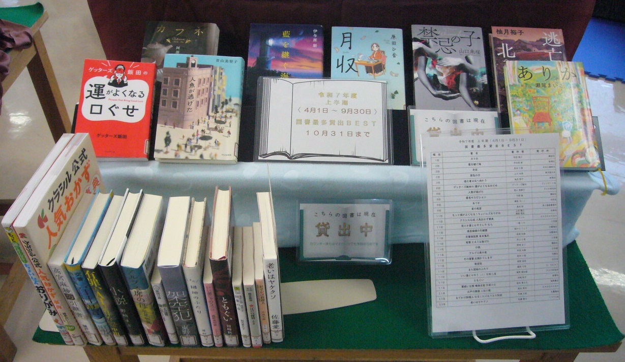 > 令和7年度の4月1日から9月31日までの間で図書室から最も貸し出されました上位27冊を並べて展示をしております。