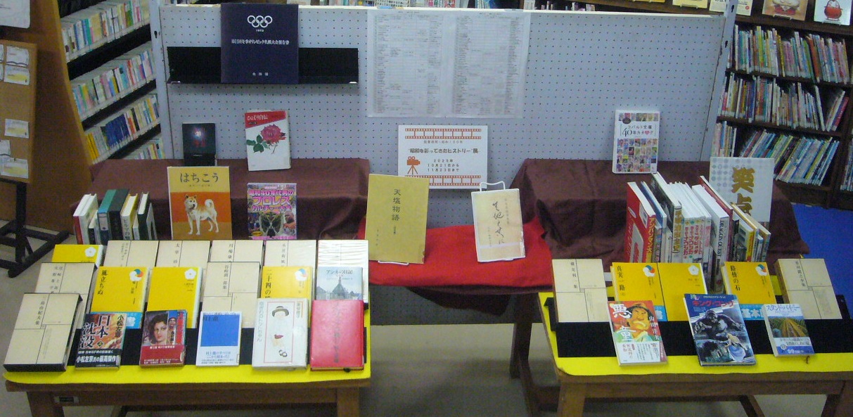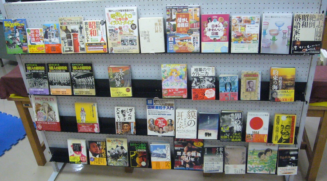 ・昭和から数えて100年となる今年にいま一度なつかしい時代を振り返って頂けたらと,1926年(昭和元年)から1989年(昭和64年)までに起こった出来事や話題になった人や物の本を100冊ほど集めて図書室で展示を致します。