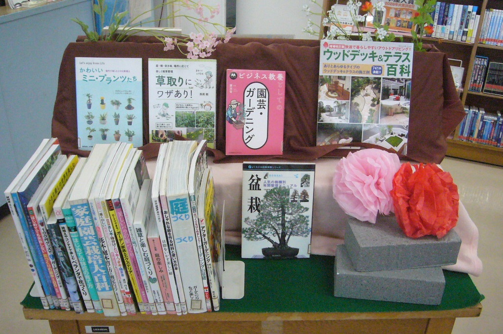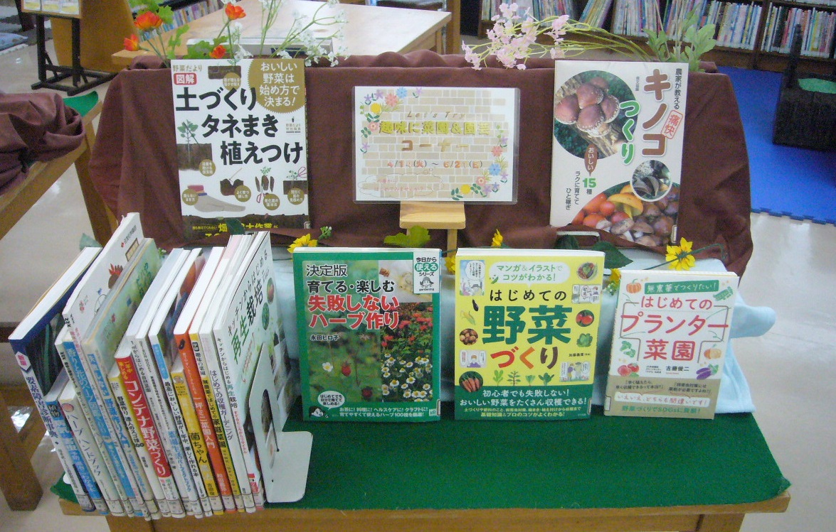 > この春から,自分で野菜を作ったり花を植えてみたいと考えていらっしゃる方に向けて,図書室から菜園や園芸,ガーデニングといった関連する本50冊を並べてコーナーを設けておりますのでぜひお越しの際には手に取ってみて下さい。